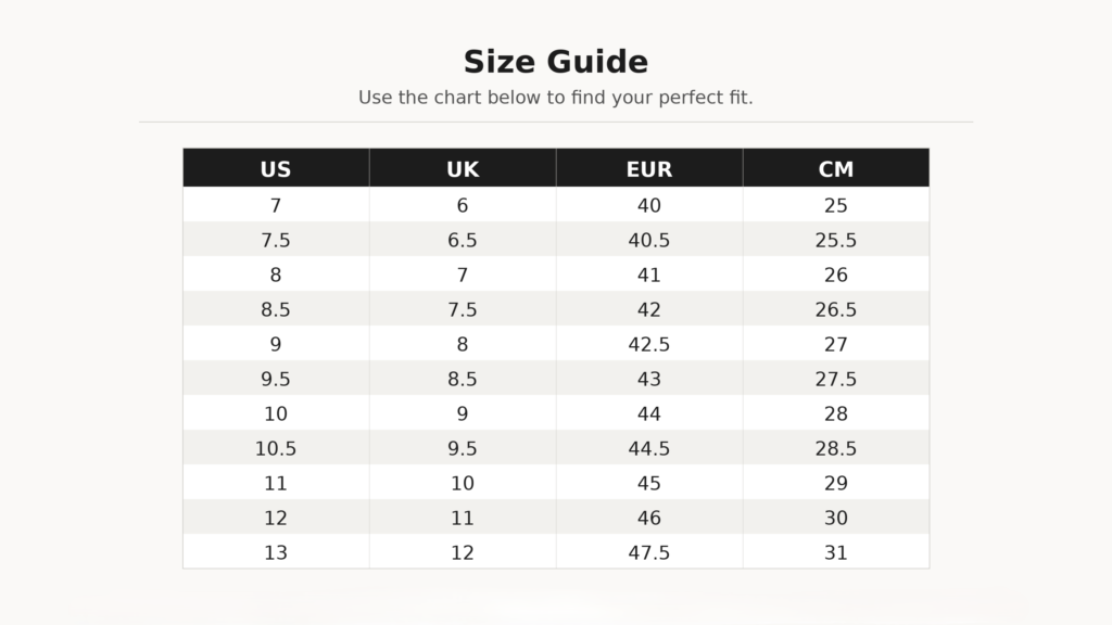 Use the chart below to find your perfect fit. If you’re between sizes, we recommend sizing up.